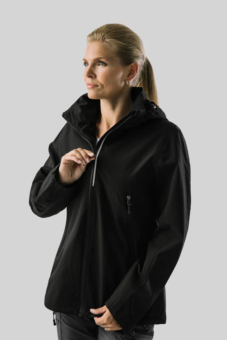 Vind- och vattenavvisande skaljacka i dampassform med tejpade sömmar. Vattentät dragkedja framtill med praktisk reflexdetalj. Jackan är mjuk och följsam med mekanisk stretch i tyget, vilket gör plagget väldigt behagligt att bära. Fodret är en kombination av polyester mesh samt slät polyester. Avtagbar huva med dragkedja och tryckknappar. Elastiska dragskor med stoppers i såväl huva som i jackans nederkant. Flärp med kardborre för justering av ärmslut. Två rymliga sidfickor med dragkedja samt en innerficka med dragkedja.