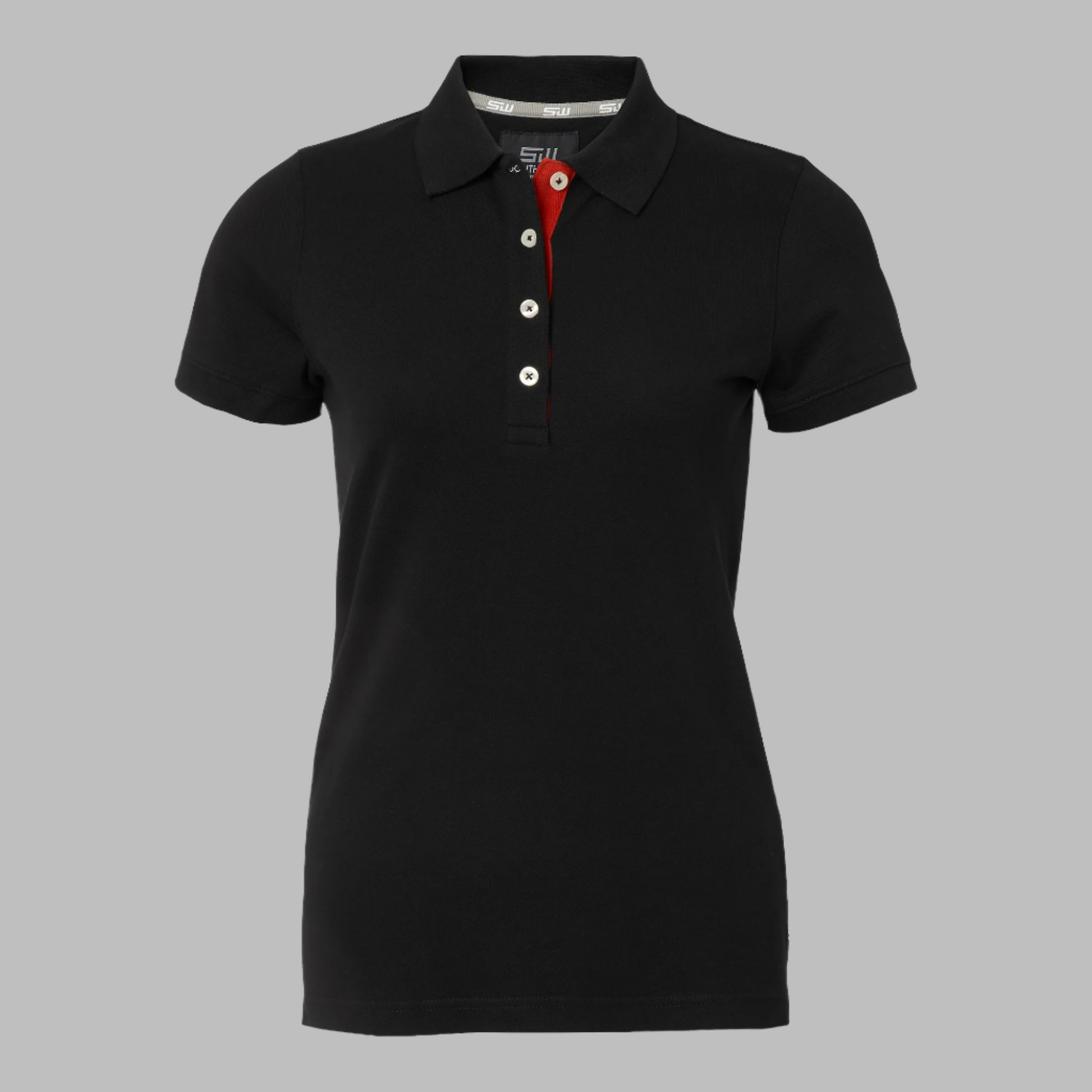 Piké med dampassform. Dekorativt band i nacke och sprund. Halvmånesöm i nacken. Längre knappslå för kvinnligare look. Knappslån har vita knappar och en fiskbensmönstrad insida i avvikande färg samt en diskret brodyr som går ton-i-ton. Brodyr i avvikande färg ovanför sprund.