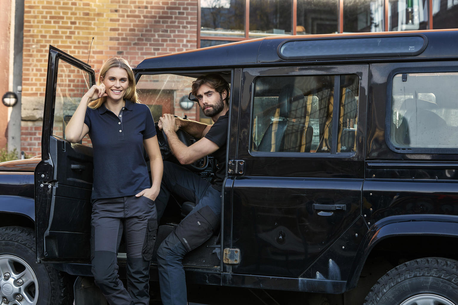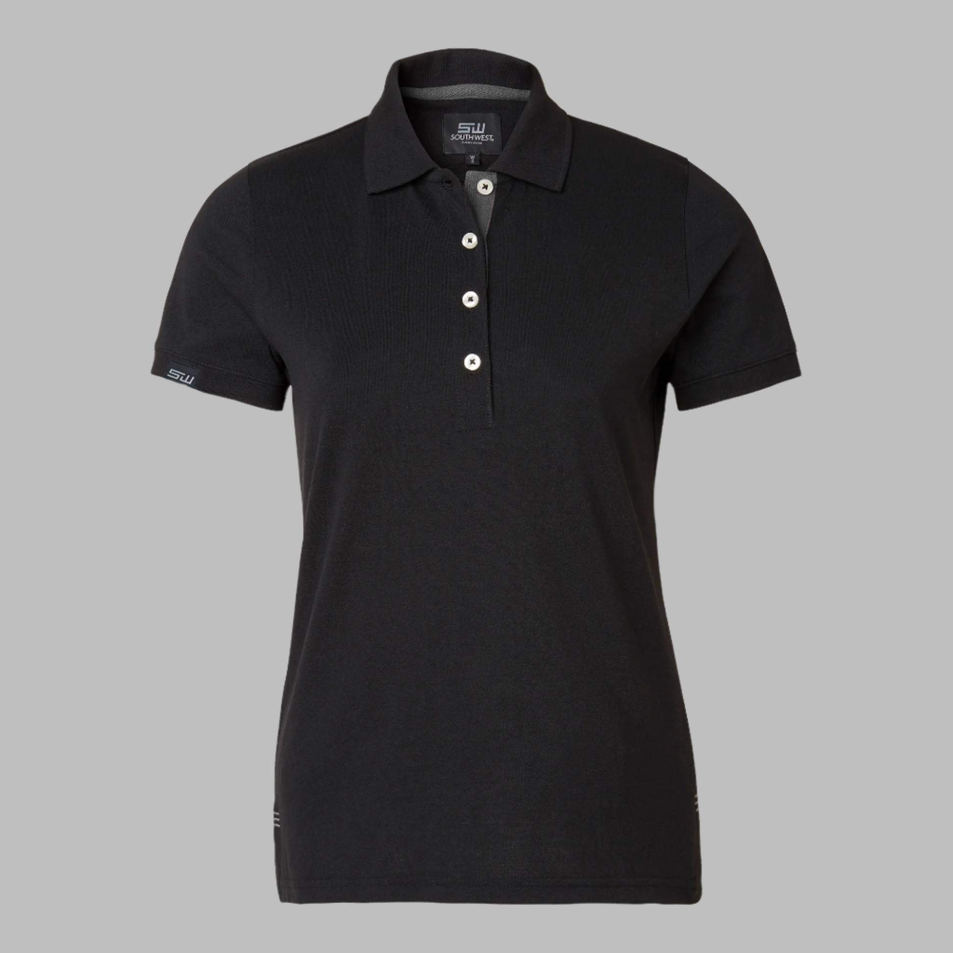 Piké i dampassform med knappslå i kontrasterande färg och vita knappar. Längre knappslå för kvinnligare look. Förstärkta sömmar. Kontrastfärg i nackband samt i brodyr vid sprund. Ribbstickad krage och ärmslut.